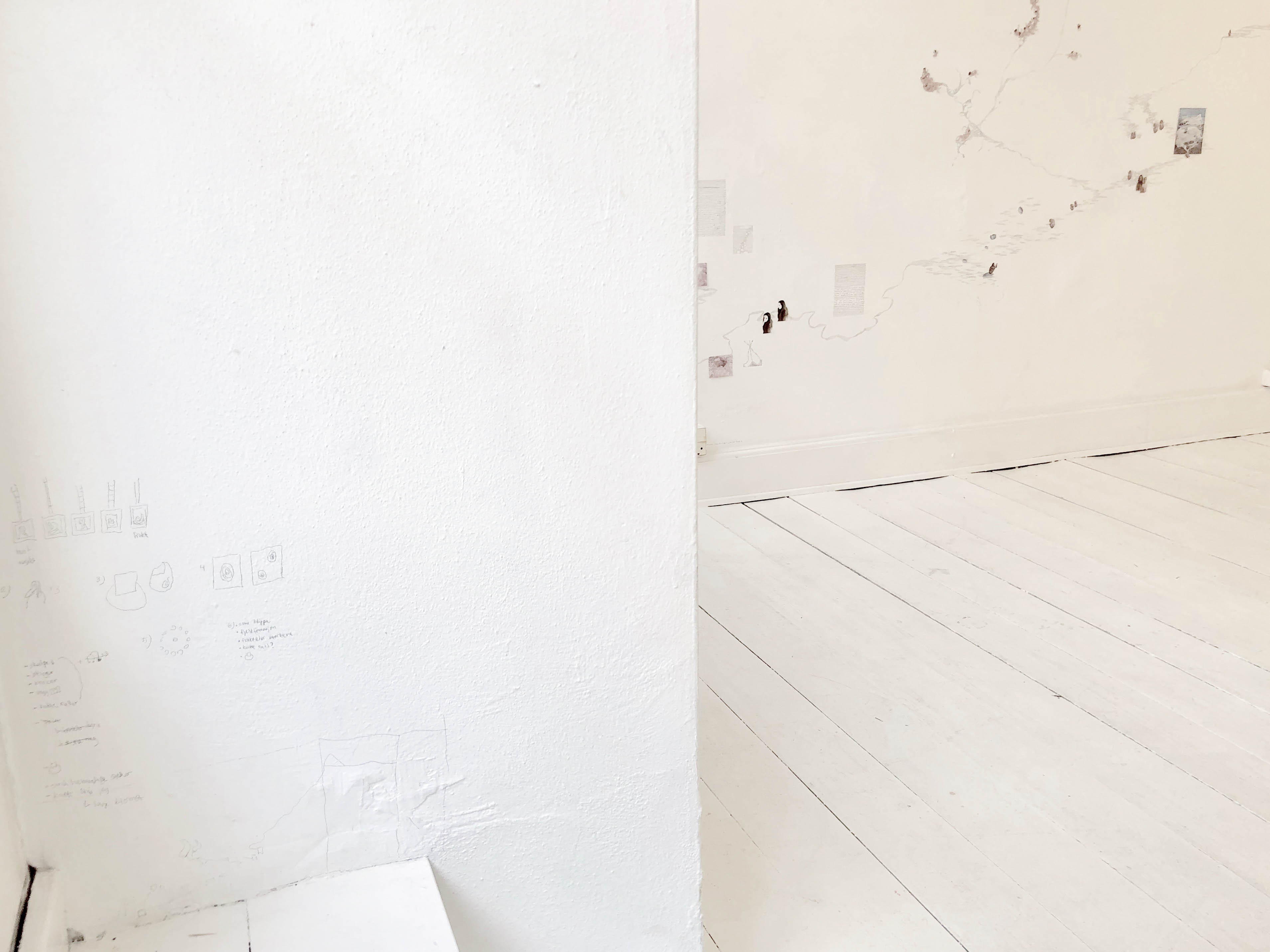 The Room as SketchbookI spent two weeks in NW Gallery, under Copenhagen photofetival 2019, using the gallery as I would work on my current sketchbook Sleeping State of Being, moving the prints from the book and to the walls, drawing, photographing and making new work both on the walls, but also in the book. Investigating the room as a medium by living, working and sleeping in the space, noting directly on the walls. Like being inside a sketchbook.